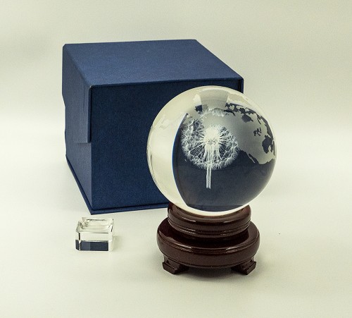 Designed exclusively by The Brat Store. The Crystal Globe has an etched map of the world surrounding a 3-D laser inscribed dandelion.